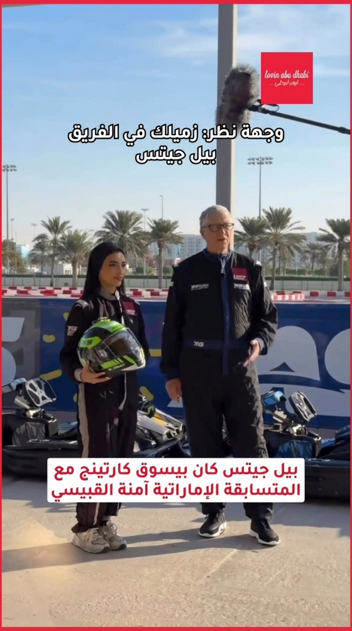 تخيل تشوف بيل جيتس يتسابق مع نجمة السباقات الإماراتية آمنة القبيسي في Kart Zone Yas! يوم عادي في أبوظبي؟ أكيد …