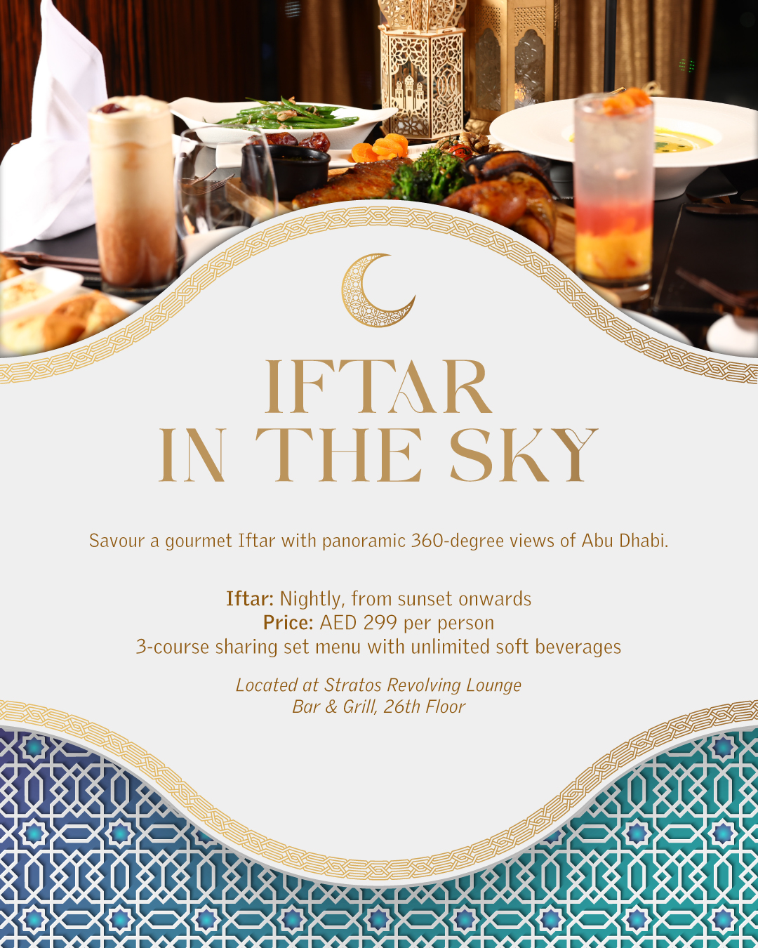 For a more elevated experience, Iftar in the Sky at Stratos Revolving Lounge Bar & Grill offers something truly distinctive. Located on the 26th floor, Abu Dhabi’s only revolving steakhouse transforms the Iftar experience into a memorable occasion. As the restaurant slowly rotates, guests can take in sweeping 360-degree views of the city while enjoying a specially crafted three-course sharing set menu.