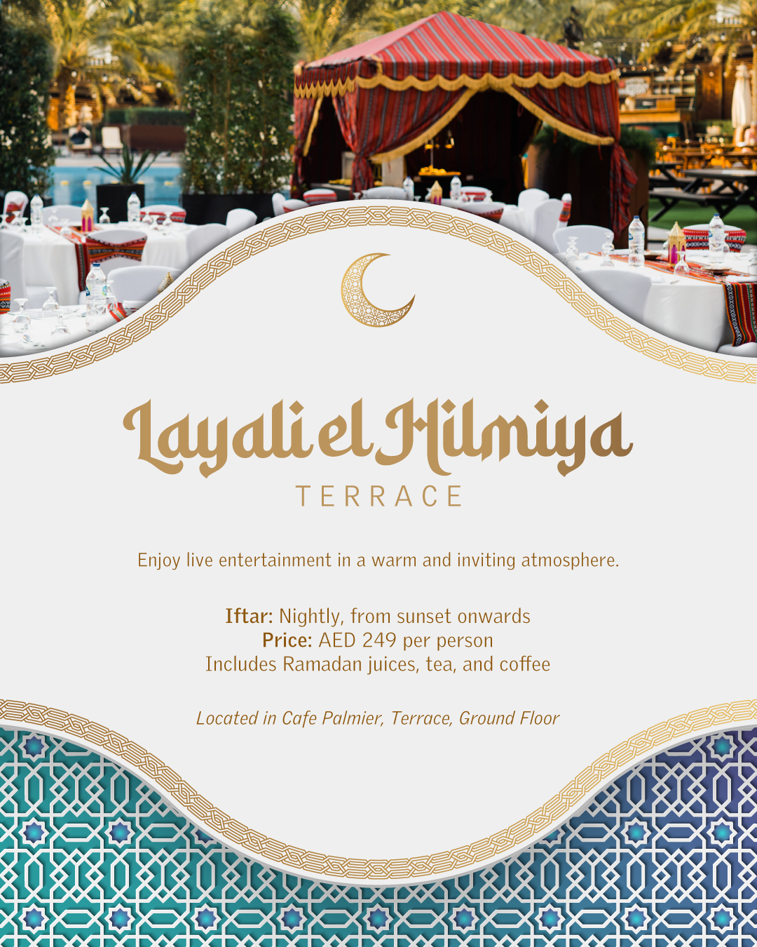 For those who enjoy dining under the open sky, Layali El Hilmiya Terrace sets the tone with a warm alfresco ambiance. The vibrant outdoor setting brings together tradition and flavour, offering a generous buffet filled with Ramadan favourites. It’s an inviting space designed for relaxed evenings with family and friends.