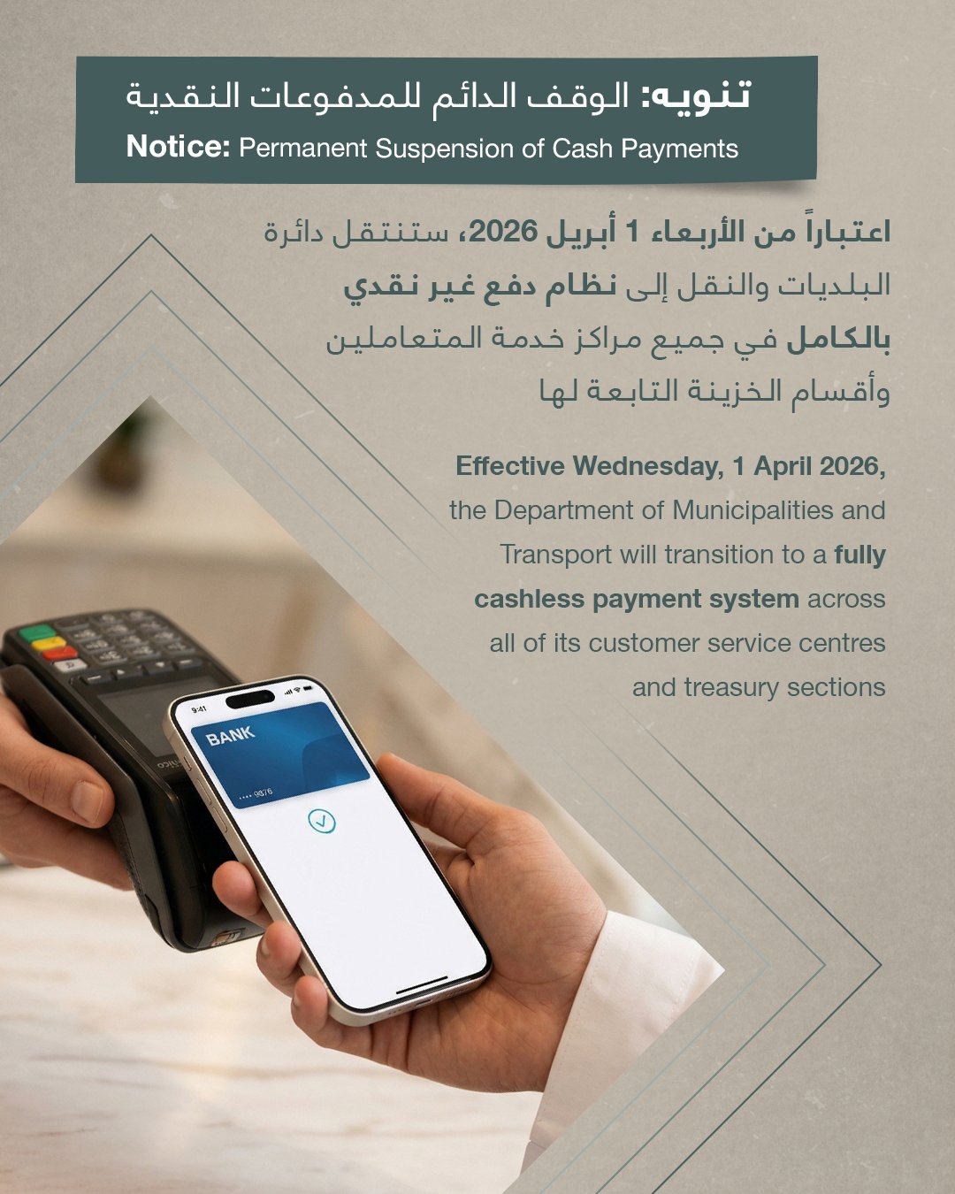 From that date, all transactions will be handled through digital platforms such as TAMM, Dari and Smart Hub. If you’re visiting a customer service centre, you can also pay easily with a credit card, ensuring a smooth, fast, and convenient experience.