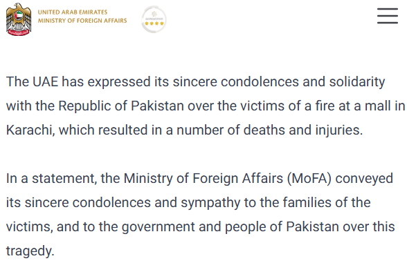 In an official statement, the UAE Ministry of Foreign Affairs shared its sympathy with the families of the victims, as well as the government and people of Pakistan, calling the incident a tragic loss of life
