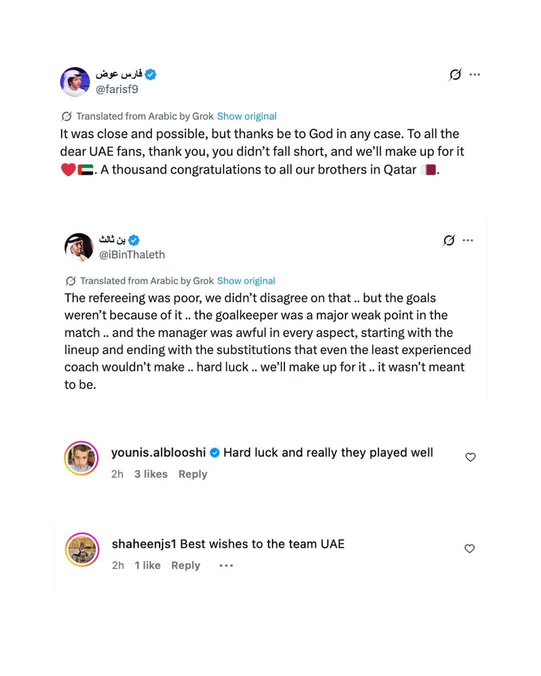 UAE fans were sad after the 2-1 loss to Qatar but still proud of the team. Some were upset about the referee, but many know there’s hope!