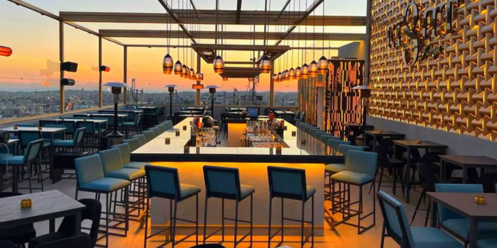 A stylish rooftop setup offering city views, fresh air, and a vibrant atmosphere for match nights.