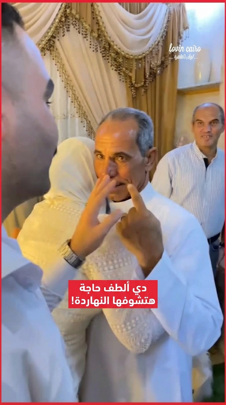 بينما يحتضن الأب ابنته بقوة، تنتقل نظراته من فوق كتفها إلى الرجل الواقف أمامهما – الذي يُفترض أنه العريس، مرتديًا قميصًا أبيض أنيقًا. في لحظة تعبر عن الكثير دون كلمة واحدة، يقوم الأب بإيماءة مؤثرة، مشيرًا مباشرة إلى عينيه بينما يحافظ على تواصل بصري مكثف مع العريس. هذه المناشدة الصامتة والقوية تم تفسيرها على أنها طلب منه للعريس ‘أن يحفظها في عينيه… حرفيًا ويحميها بكل ما يملك’. إنه تعبير خام وصادق عن ثقة الأب وأعمق أمنياته لسعادة ابنته وسلامتها في حياتها الجديدة.