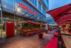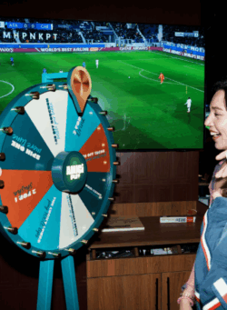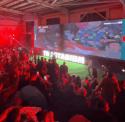 Outdoor arena vibes and massive TVs.