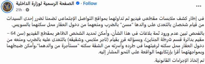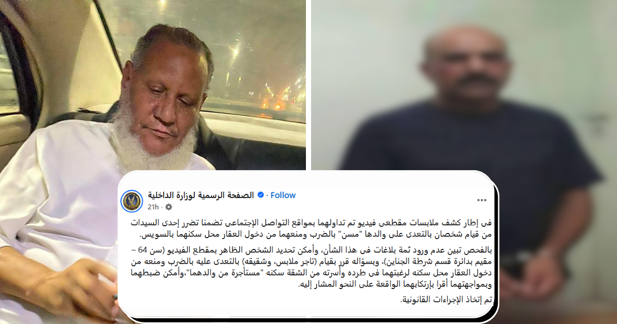 The footage shows a man repeatedly slapping an elderly man, 3am Ghareeb, who is a tenant in a building in Suez.