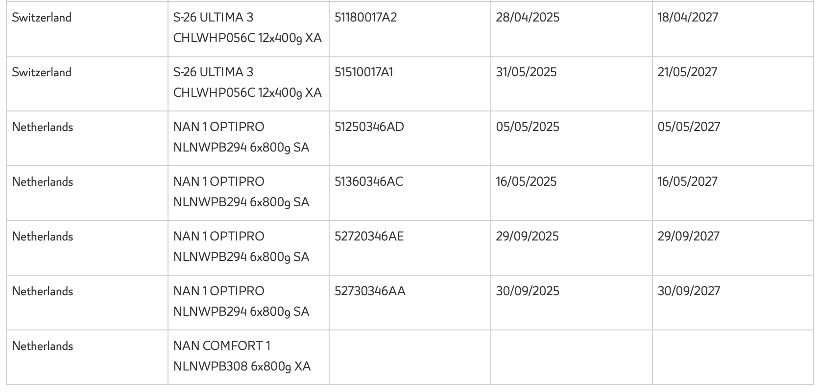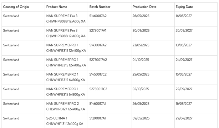The advisory urges parents and caregivers to carefully check product names and batch numbers before use, prioritising the health and safety of infants.