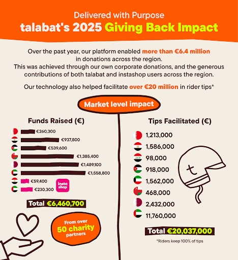 Giving Back and rider tipping aren’t seasonal campaigns or one-off features. They’re permanent parts of the talabat platform, designed to make giving simple, traceable, and scalable. Funds flow directly to riders and charity partners, with no platform retention, just straight-up impact.