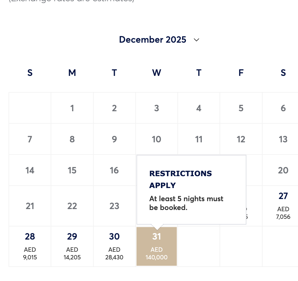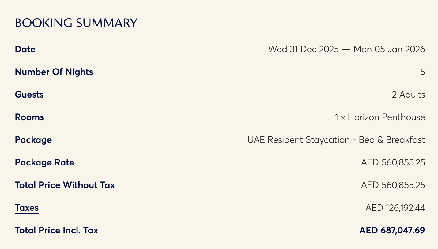For UAE residents, booking the Horizon Penthouse for the required five nights comes to a total of AED 687,047.