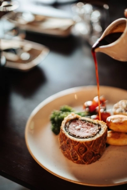 Every Saturday from 12:30 PM, you can enjoy a classic Brit experience cutting into that absolutely delicious Wellington, served with melt-in-the-mouth potato, onion marmalade, beef jus, and a crisp Yorkshire pudding.