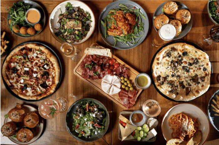 Start with fresh salads like feta & zhoug fattoush, Jones chicken Caesar, or spice roasted cauliflower & crispy chickpea. Then dive into starters like chicken karaage with sambal mayo, crispy calamari, shrimp or veggie tostadas, and a cold seafood station with black mussels and cocktail shrimp.