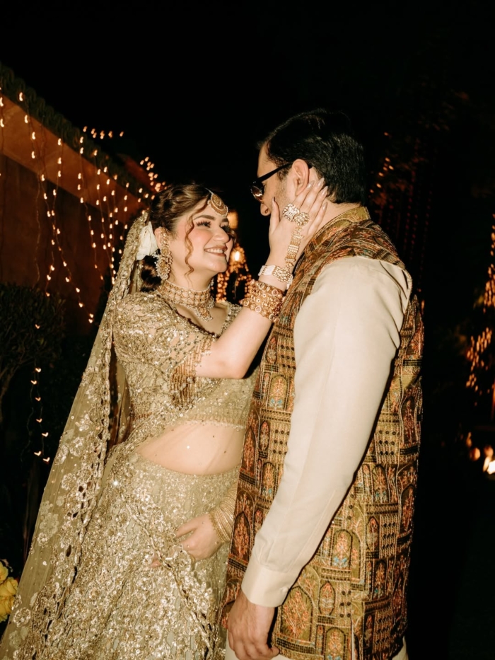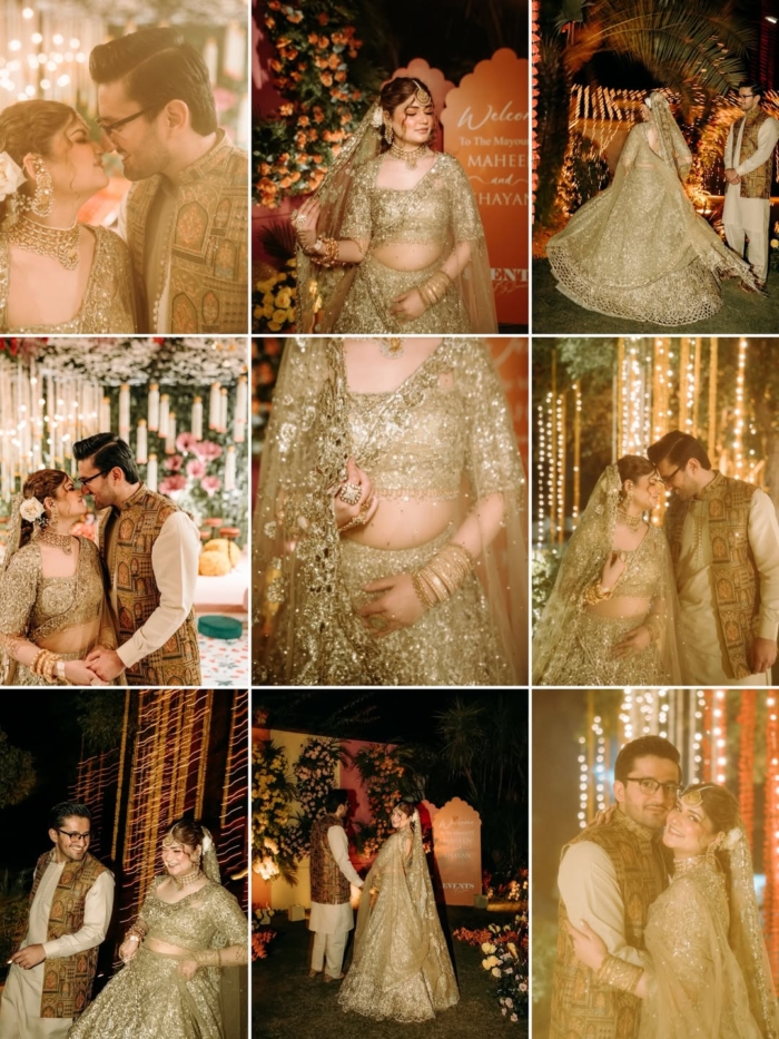 Maheen stuns in a gold lehenga, radiating elegance, while fiancé Shayan complements her look perfectly. Additionally, the couple’s chemistry captures the hearts of everyone, making them the stars of the evening. Fans admired their smiles, graceful movements, and joyful glances.