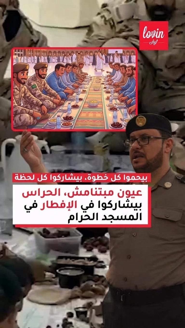 افتتح الفيديو الفيروسي بضابط أمن سعودي، ممهدًا لمشهد مؤثر حقًا. أبرز الفيديو الجهود الدؤوبة لأولئك الذين ‘يَحْرُسُونَ كُلَّ خُطْوَةٍ، يَتَشَارَكُونَ كُلَّ لَحْظَةٍ’ و’عُيُونٌ لَا تَنَامُ’، مؤكدًا تفانيهم. انتقل المشهد بعد ذلك برشاقة إلى العديد من ضباط الأمن، يرتدون زيهم المموه، وهم ينزلون درجًا واسعًا. وما تلا ذلك كان أكثر بهجة: ضباط يرتدون زيًا عسكريًا يجلسون على الأرض، يتشاركون وجبة الإفطار جنبًا إلى جنب. كان لكل منهم أطباقه الفردية، مصحوبة بزجاجات بلاستيكية منعشة للمشروبات. ومما زاد المشهد جمالًا، كان عامل مسجد، يمكن التعرف عليه بسهولة من زيه الأزرق الداكن الذي يحمل كلمة ‘Housekeeping’ و’النظافة’ بالعربية، جزءًا من هذا التجمع الجميل. هذا المقطع، الذي انتشر على نطاق واسع على منصة X (تويتر سابقًا)، صور بجمال ضباط الأمن وعمال المسجد وهم يفطرون معًا بعد يوم شاق من الخدمة، وهو دليل حقيقي على روح الزمالة داخل الجدران المقدسة للمسجد الحرام، كما أفادت الإخبارية.