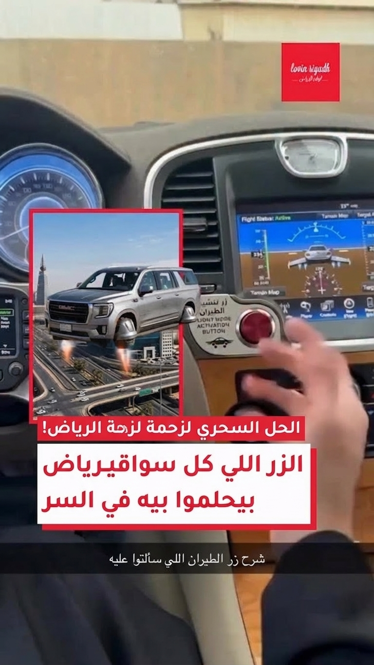 يفتتح الفيديو داخل سيارة، يعرض لوحة القيادة وشاشة معلومات وترفيه، لكن النجم الحقيقي هو جهاز مخصص يشبه مقبض ناقل الحركة. تضغط يد بثقة على زر أحمر ساطع، مكتوب عليه بوضوح باللغة العربية ‘زر تنشيط الطيران‘. على الفور، تنبض سيارة دفع رباعي فضية متحركة على الشاشة بالحياة، تطلق دفعات نفاثة من عجلاتها وترتفع بشكل دراماتيكي عن الأرض، محلقة فوق أفق مدينة صاخبة. يلتقط النص المتراكب المزاج تمامًا، معلنًا أن هذا هو ‘الحل الأمثل لزحمة الرياض!‘ و ‘الزر الذي كان سائقو الرياض يتمنونه سرًا‘. إنه نوع الابتكار الذي يجعلك تتساءل عما إذا كان تنقلاتك الصباحية يمكن أن تكون بهذا القدر من الإثارة.